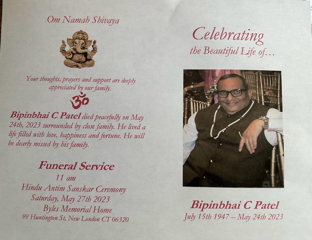 We regret to inform sad demise of our 14gaam patidar's Shri Bipinabhai C Patel of Rangaipura on 24th May 2023 at his residence. He lived about 76 years of life. He left behind wife Bhanuben Patel, a son Nitiraj Patel and a daughter Basil Patel.